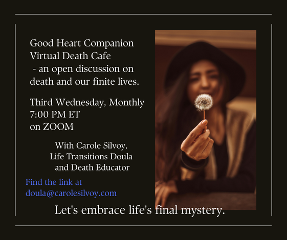 Carole Silvoy is a Life Transitions Doula, trained as an EOL Doula, Holding Space Consultant, and Death Educator. Her philosophy supports Death Positivity and a Good Death.