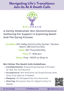 Local Marin County, CA End-of-Life Doula Christine Comaford is offering a Death Cafe on the 4th Thurs of each month through 2024.