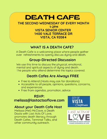 I'm proud to partner with the Gloria McClellan Senior Center in Vista, CA who has generously sponsored the space for the Vista Death Cafe.
