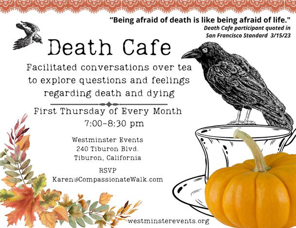 We invite you to gather on the 1st Thursday of every month at our death cafe -- a safe place to embrace mortality and our shared human experience.